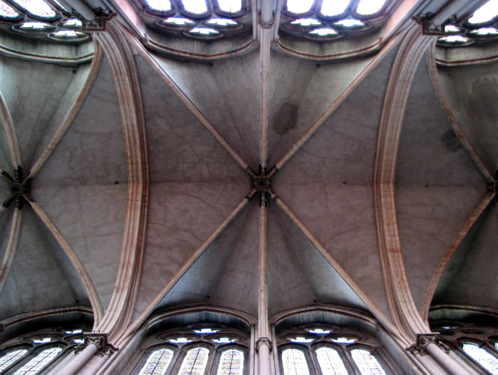 Sexpartile or septpartile, etc vaults that incorporate a framework or diagonal ribs to channel weight into supporting columns, allowing for thinner walls and larger windows, as well as pointed arches. However, these new thinner features were not implemented until Gothic, Romanesque was still quite heavy feeling.