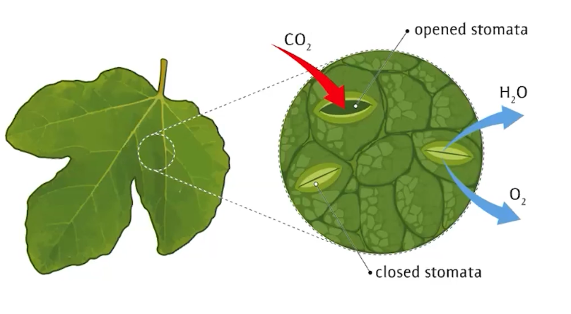 When stomata are open, CO2 can enter the leaf and O2 and H2) can be released into the atmosphere