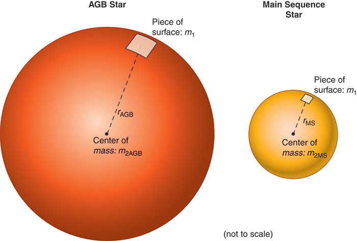 An AGB star expands to a much larger size (rAGB) than it did during the red giant phase for our Sun. Recall that the force of gravity between two objects is given by this equation, where m1 and m2 are the masses, and r is the distance between them: .