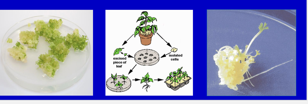 —> callus can then be transferred to other agar plate with another mix and proportions of plant hormones initiating the germination and differentiation of the callus to a plant.