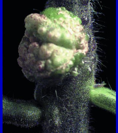 Infection of plants by Agrobacterium tumefaciens causes “crown gall” tumors—> large, undifferentiated cell masses.