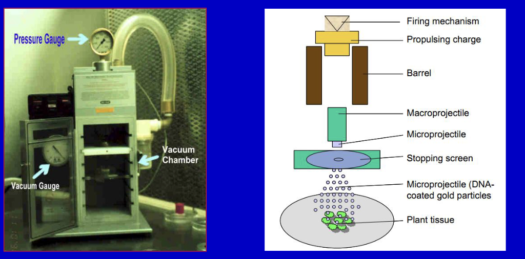 —> system works by taking microscopic beads (made of metal) and coat the outside of the beads with the piece of DNA you want to transfer- the beads are packed into cylinder (micro projectile) and loaded into a larger cylinder (macro projectile) which in turn is loaded into the “barrel”- then the plant tissue you aim to transform is inserted- you close the door and add a vacuum (to remove air resistance)- the macro projectile is then fired down the barrel which have a mesh- the mesh will stop the macro projectile but have holes large enough to let the beads pass through- resulting in the micro projectiles being shot into the plant tissue