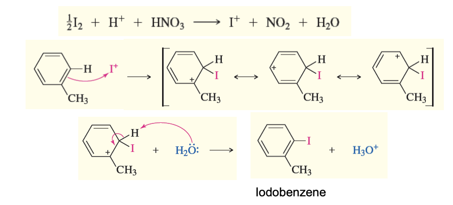 Iodine (I) + Nitric acid (HNO3) react with toluene replacing H with I