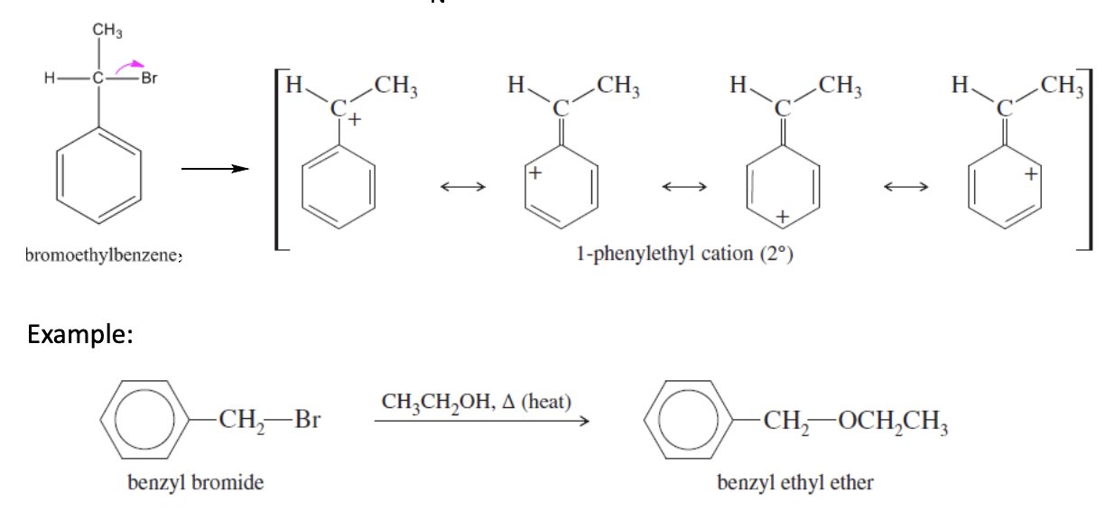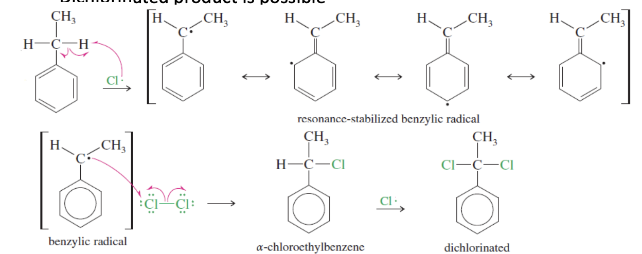 Ethylbenzene reacts with radical bromine —> resonance stabalized —> Br-Br —> Bromoethylbenzene