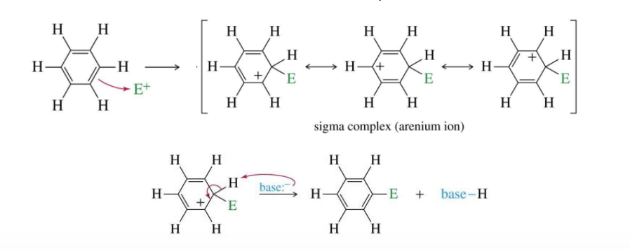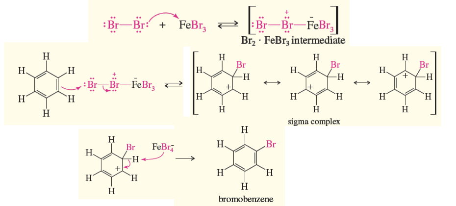 Benzene + FeBr3 —> carbocation/sigma complex —> deprotonated by FeBr4 to gain bromobenzene
