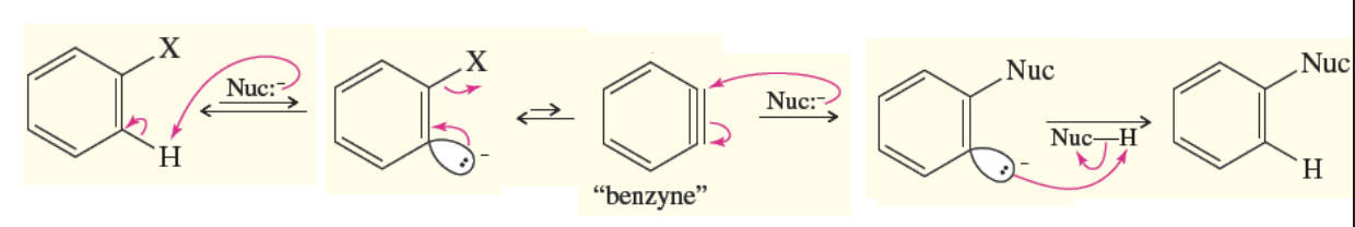 results in an intermediate benzene and a final product of benzene with a nuc replacing the halogen (still nuc substitution)