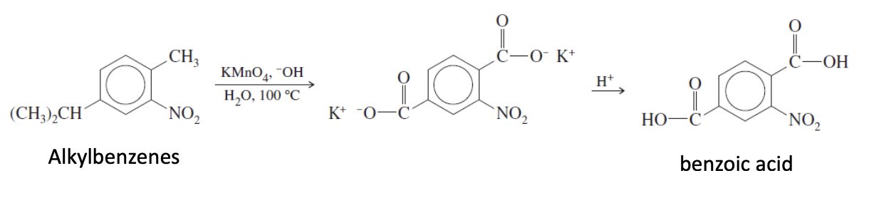 alkyl benzene + KMnO4, H20, H+ —> Benzoic acid