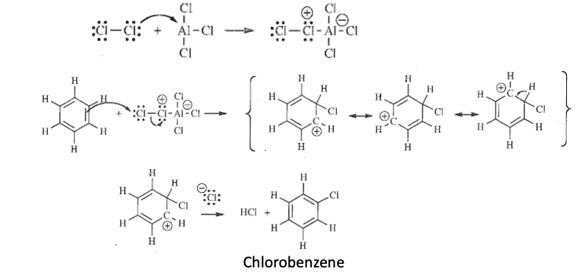 Benzene + AlCl5 reagent —> sigma complexes with carbocation —> deprotonated by Cl- —> chlorobenzene formed