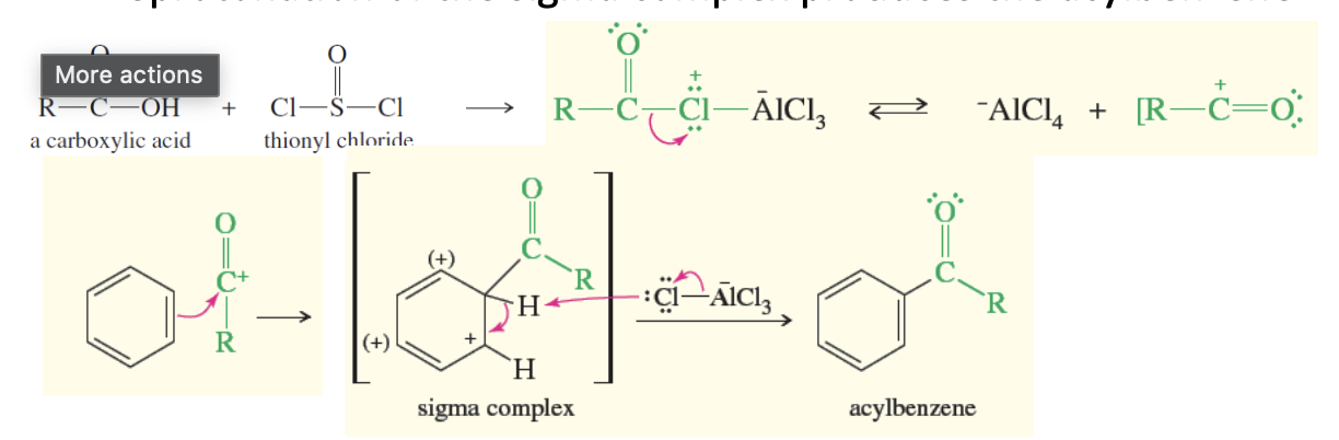 r-c=o + benzene ring —> sigma complex —> +alcl4 —> acylebenzene
