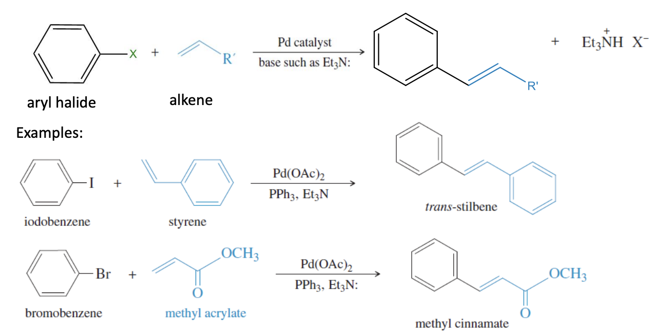 Aryl halide + alkene —> PdOAc2 catalyst with PPh3 Et3N —> coupled product