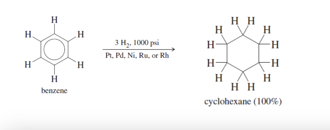 done under heat and pressure + catalyst presence (Pt, Pd, Ni, Ru, Rh)