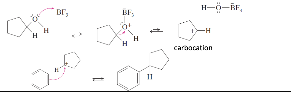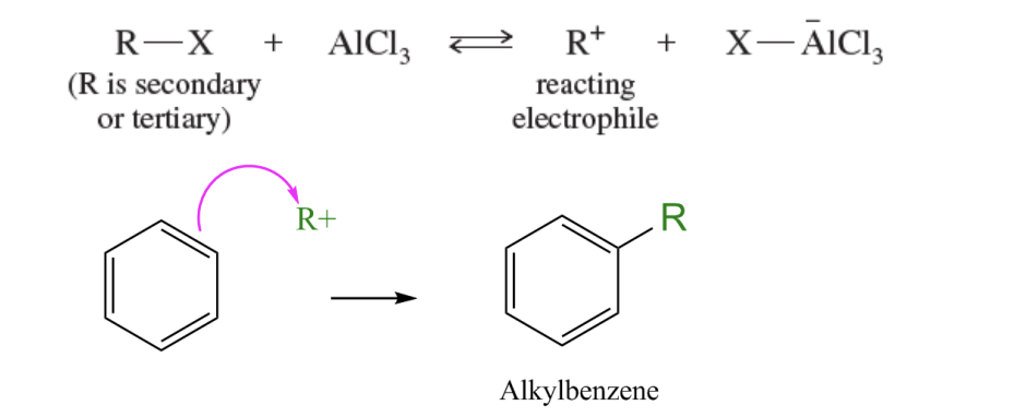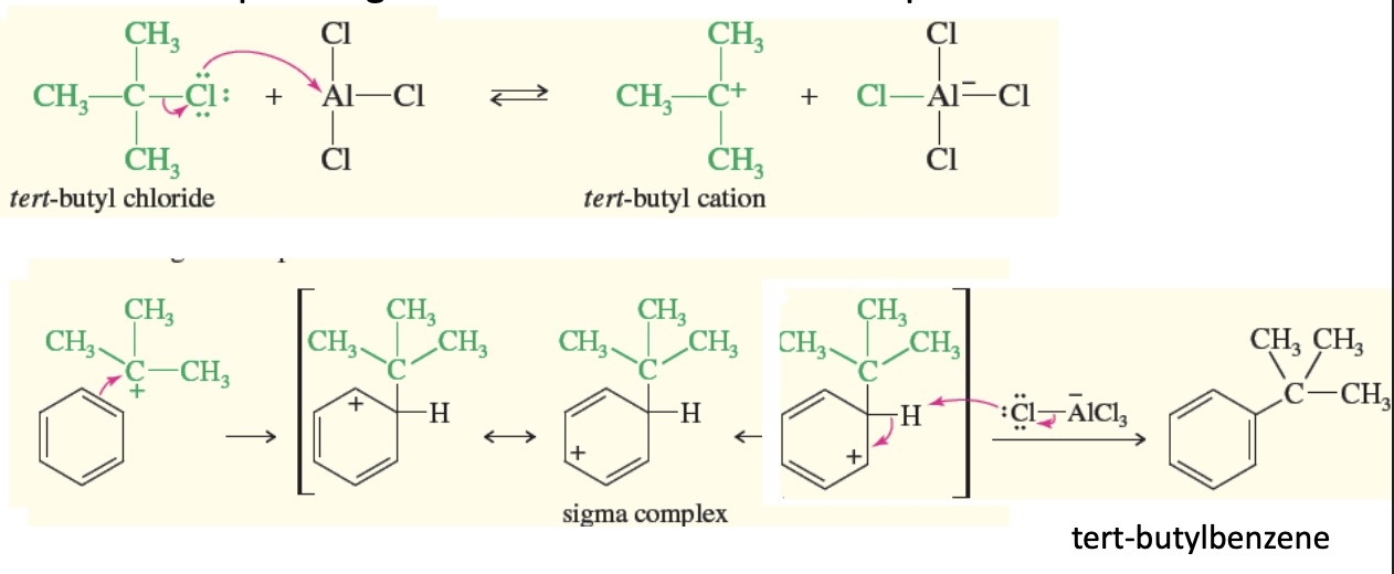 Sec or Tert alkyl halide + AlCl3 or FeCl3 —> alkyl carbocation —> Benxene + alkyl carbocation —> sigma complex resonance stabalized —> alkylbenzene