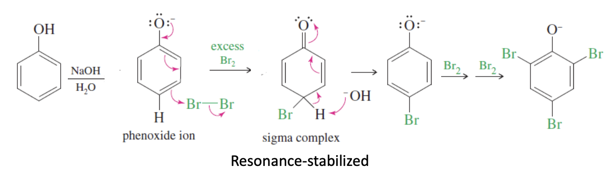 Phenol —NaOH, H20 —> Phenoxide Ion Formed —> +Br2 —> sigma complex —> 2 Br2 —> tribromo phenol