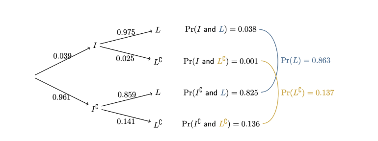 Times first branch with following branch to get desired probability, e.g. to get Pr(I and L) = 0.039×0.975 = 0.038