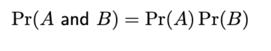 Two events A and B are independent if Pr(B | A) = Pr(B) (event A occurring does not change probability of B occurring)