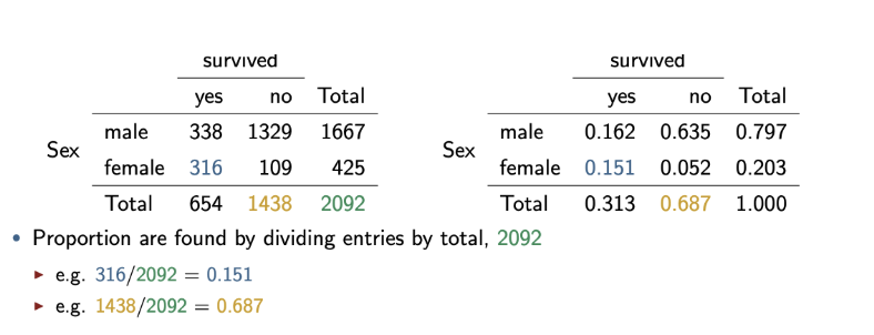 e.g. probability male and survived: Pr(M and S) = 338/2092 = 0.162