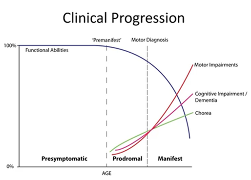 25-35 – will not develop symptoms but pass on very highly repeated Huntingtin gene to progeny, so children are at risk.