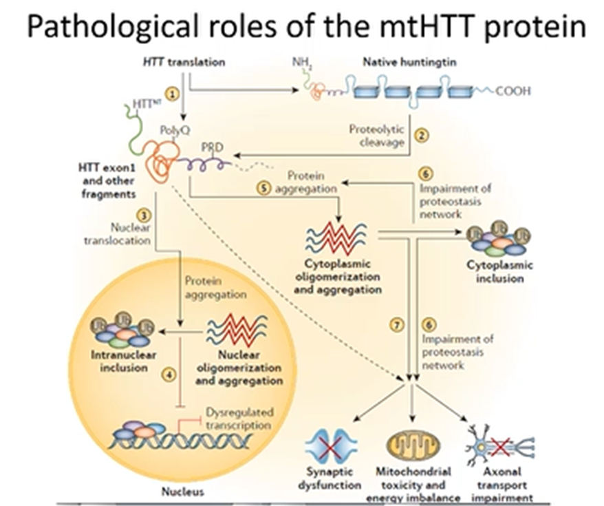 Normal huntingtin protein will go through normal physiological expression and proteostatsis —> when the protein is not needed to it will be degraded