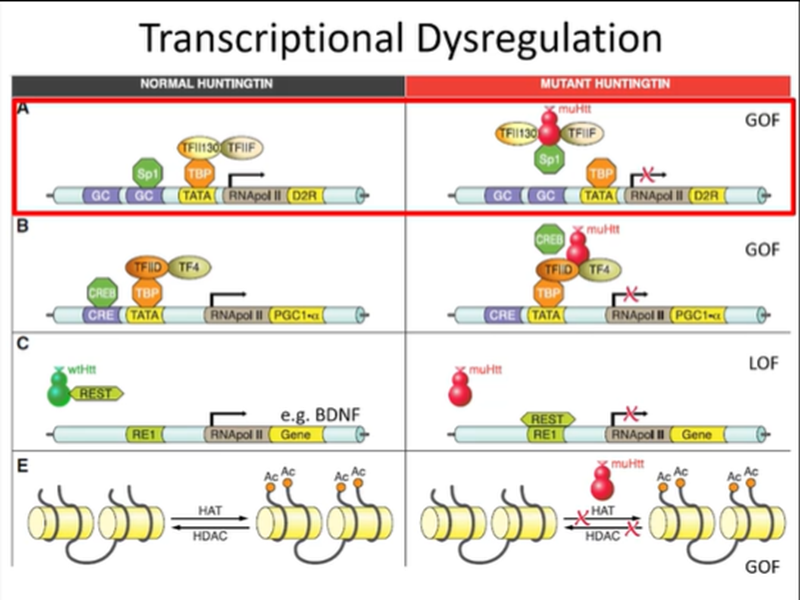 wtHTT is known to bind to REST which is an inhibitor of transcription of some genes like BDNF and RNA pol2 —> however, the mutated protein cannot complete this function and results in the supressed expression of these genes