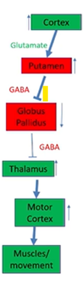 Usually have the cortex sending Glu (excitatory) projections to the putamen which is inhibitory