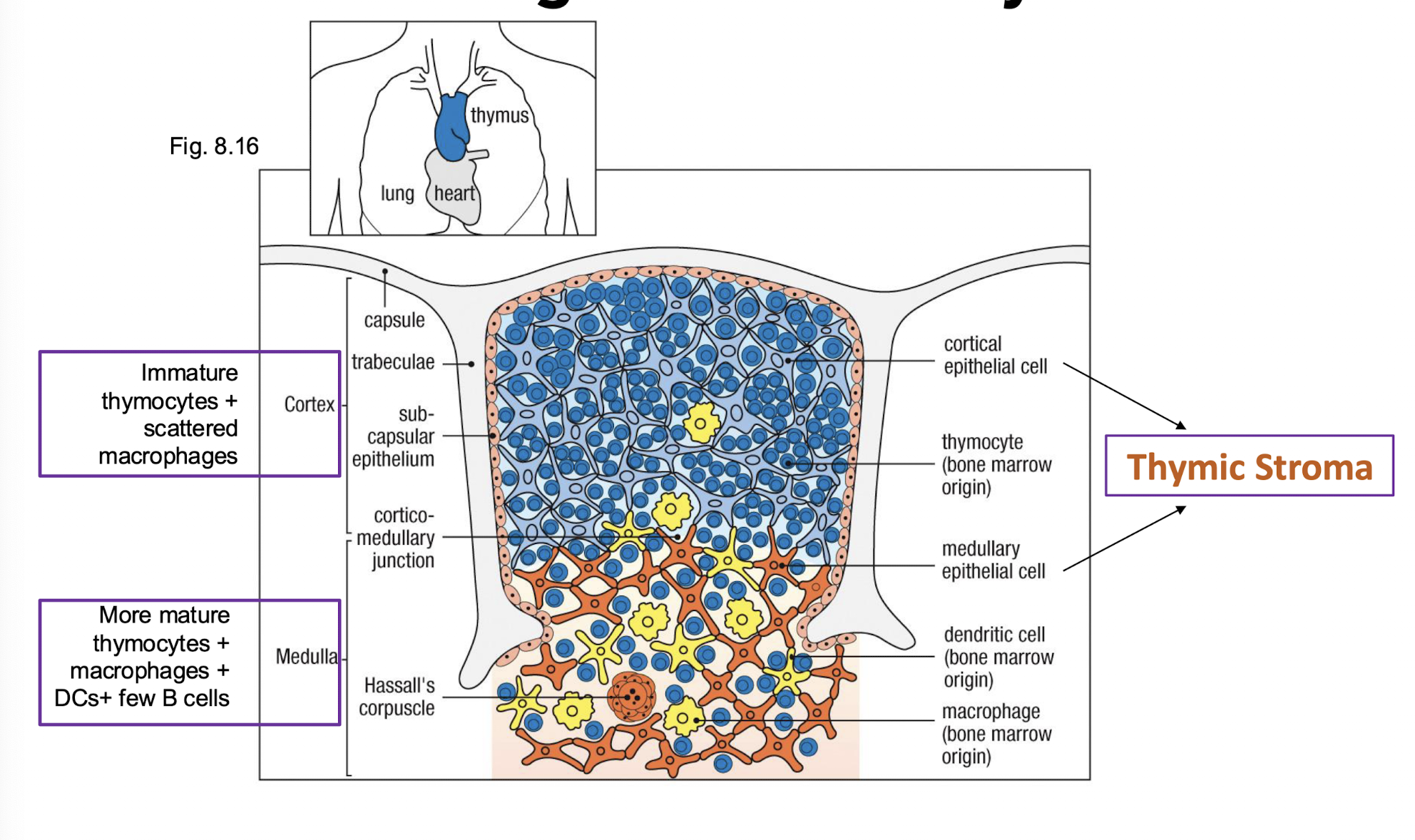 stomal cells → structural support and the development of thymocytes → cortical epithelial cells and medullary epithelial cells are the stromal cells