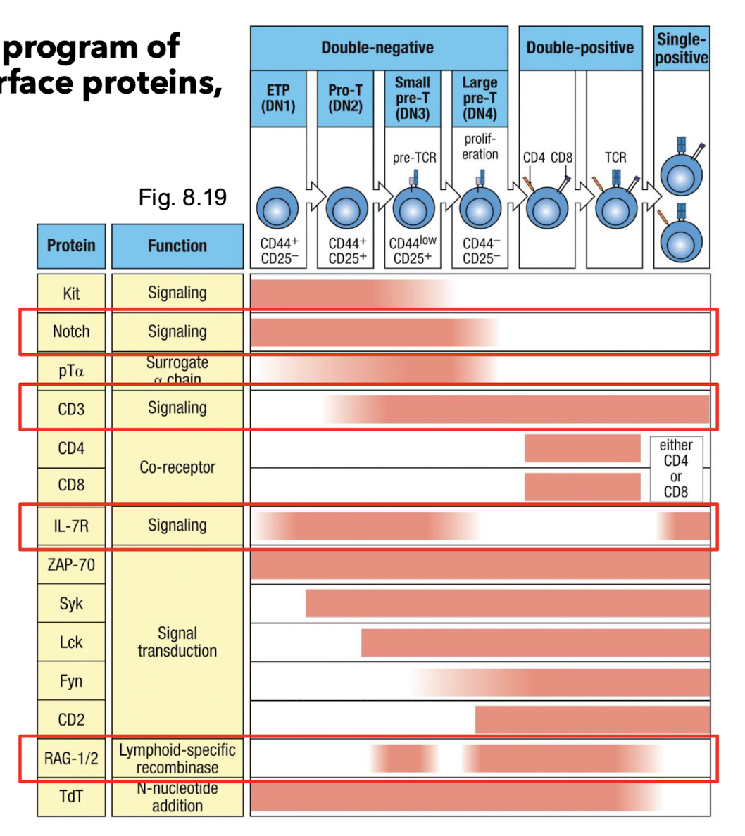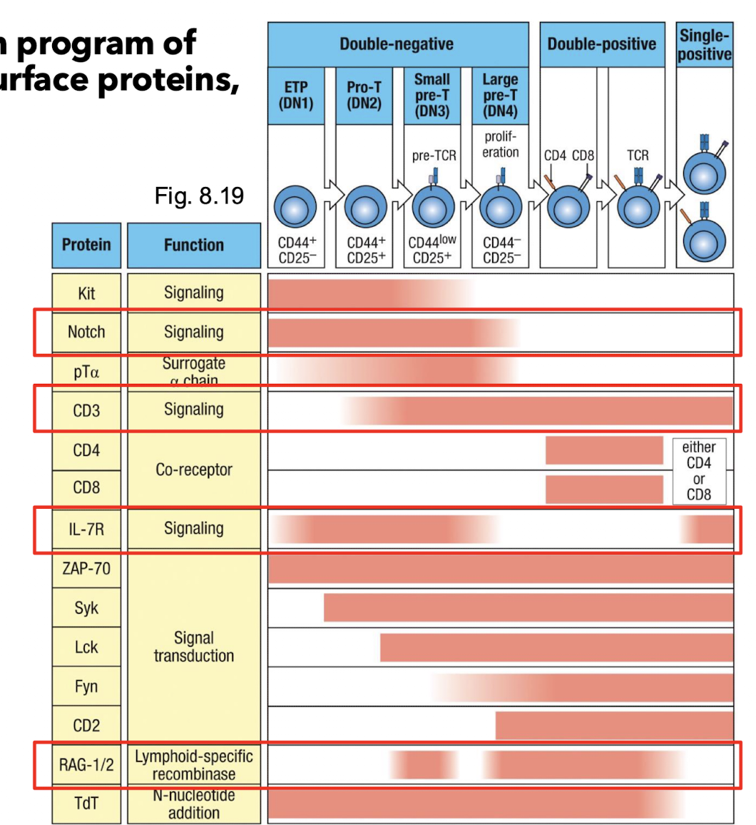 commitment signal. → directs progenitor entering thymus to become T cell instead of B or NK cells