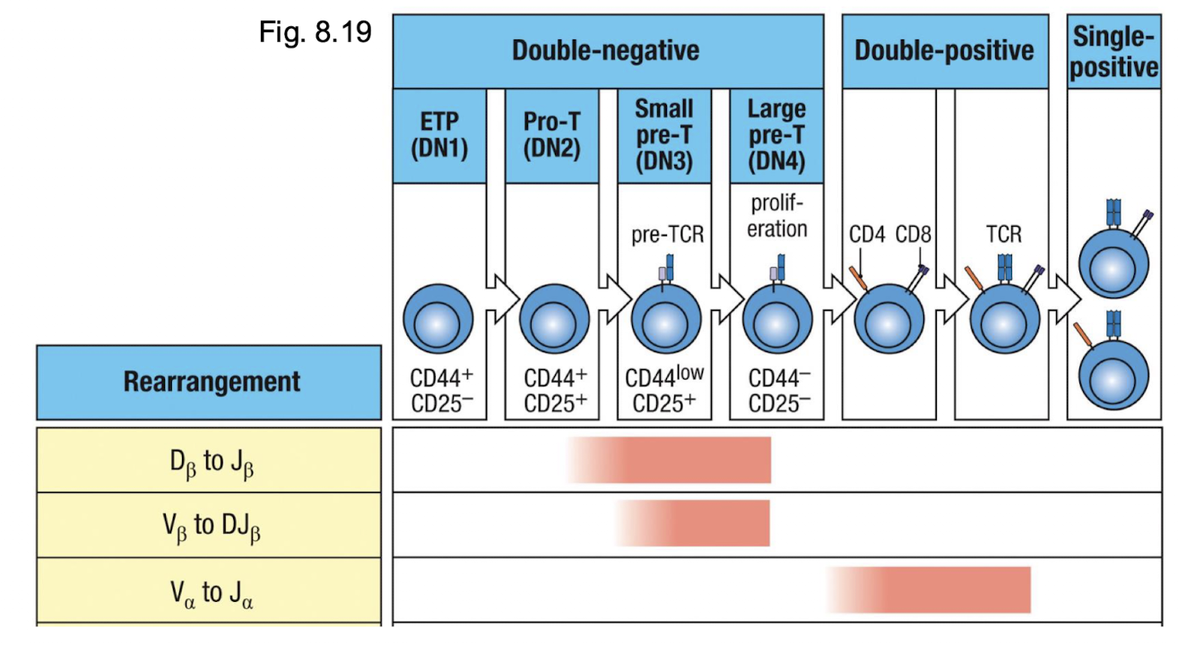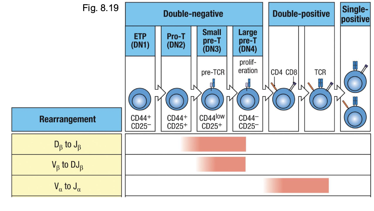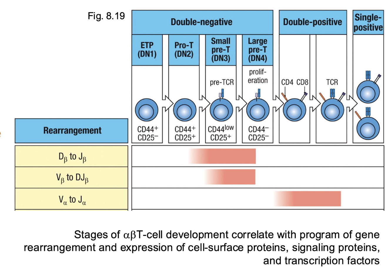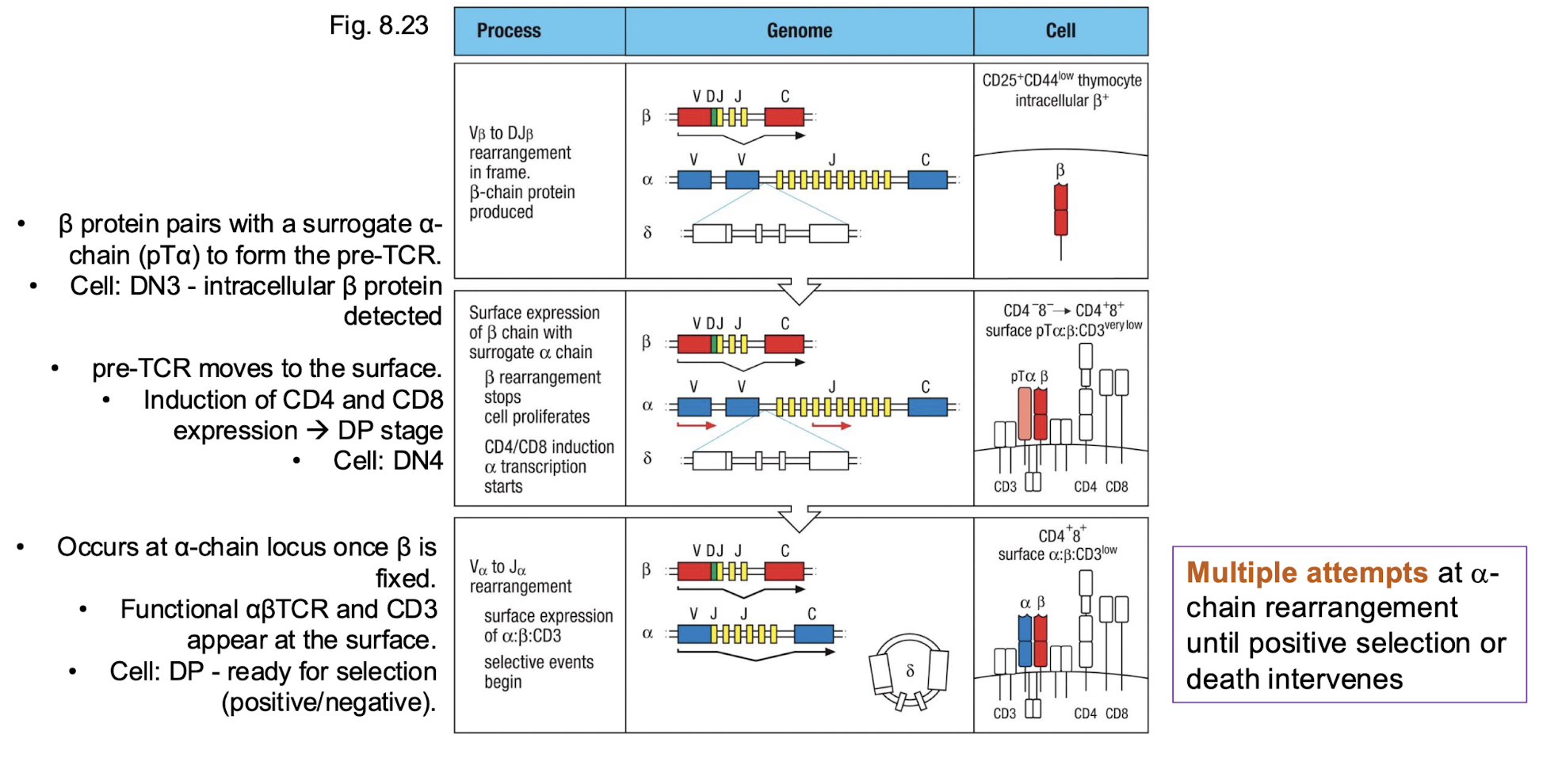 expression of CD4 and CD8 initiates the rearrangement of alpha chain locus in DP cells → alpha chain pair with the already functional beta chain formed a complete alpha beta TCR on cell surface