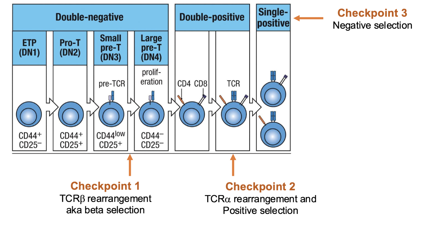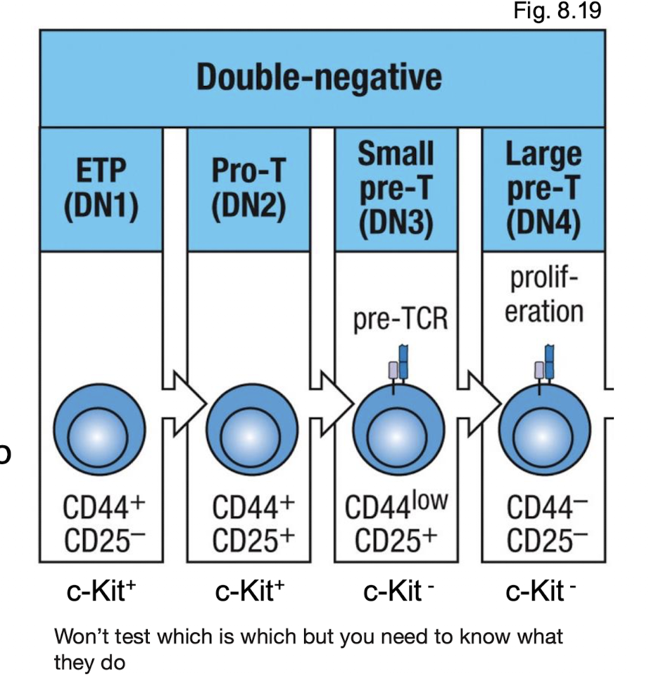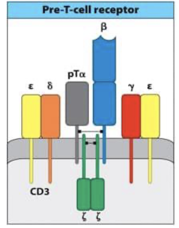 Pre-TCR = β-chain checkpoint that drives proliferation and triggers α-chain rearrangement.