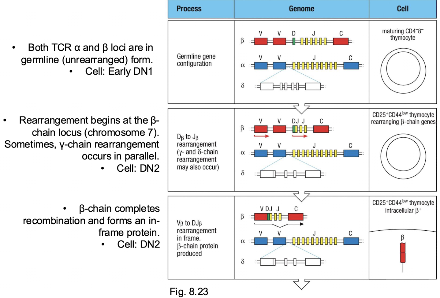 Once a productive rearrangement at the β-chain locus has taken place (as tested by the formation of a functioning pre-T-cell receptor), events occur to prevent further recombination of the β chain. This recombination shutdown is referred to as allelic exclusion. This process is vital because it prevents the thymocyte from producing more than one functional β chain as it continues development. → why each only had one type of TCR