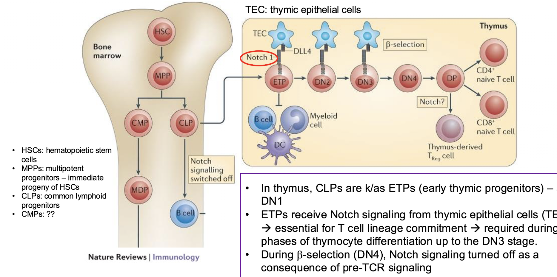 commitment to T cell lineage occurs in the thymus after Notch signalling → tells to become a T cell from a common lymphoid progenitor