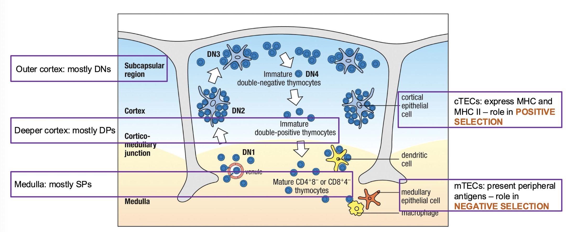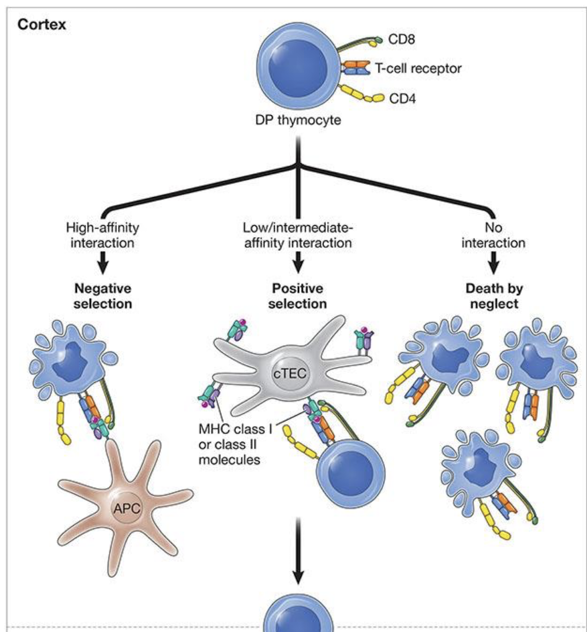 each thymocyte carefully tested to make sure it can recognize shelf MHC with self peptides and that it wont react strongly against the body own tissues