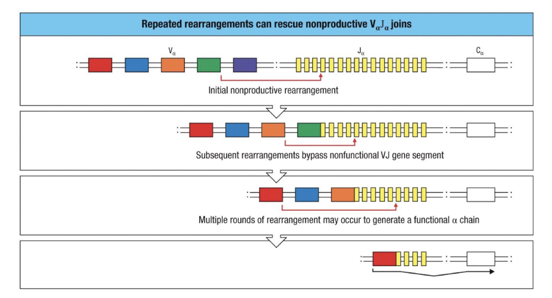 allows for suquential recombination → if one is non function then the cell can try again using different V alpha and J alpha combination upstream or downstream