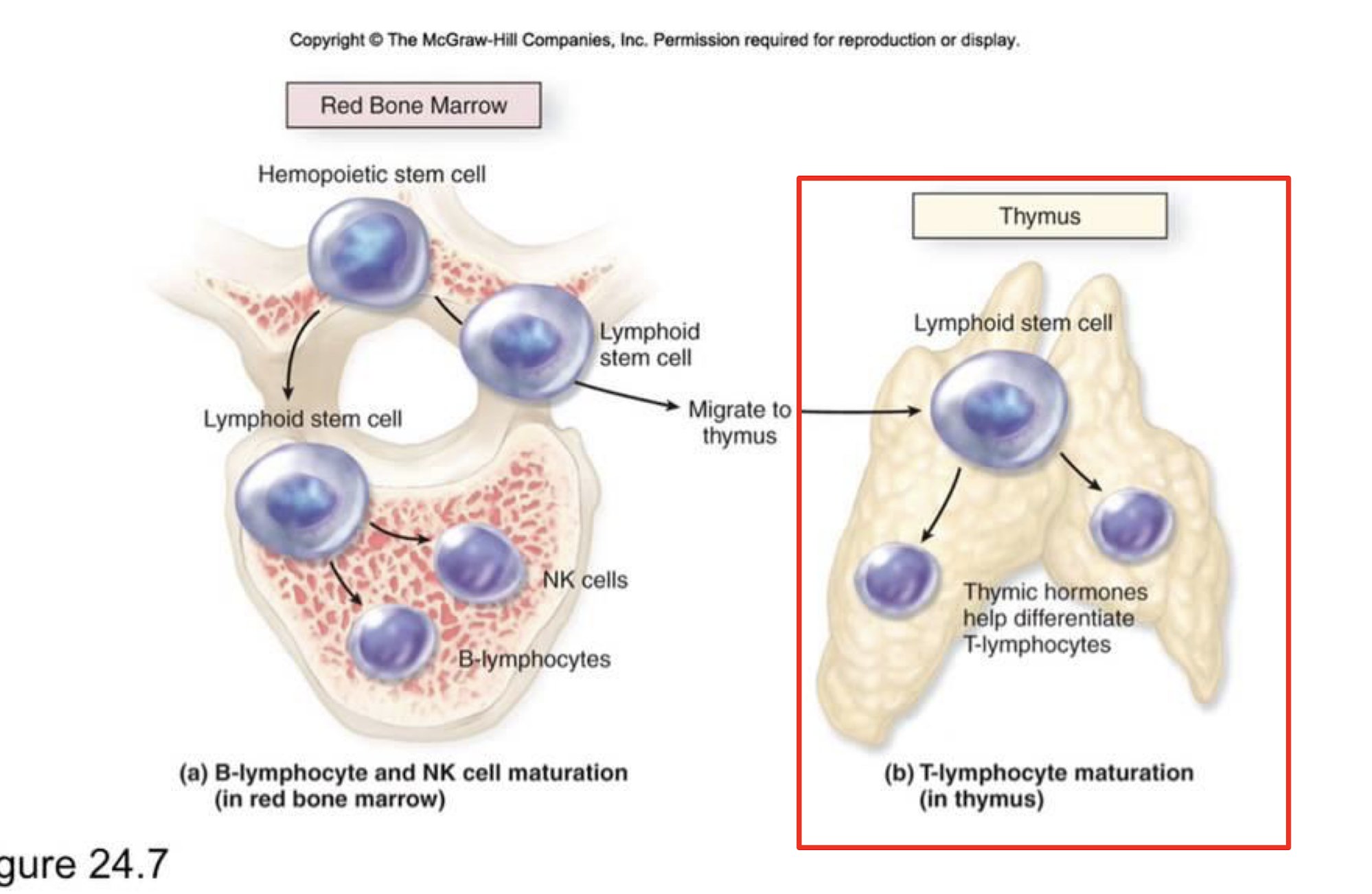 common lymphoid progenitors travel in the blood as immature T cell precursors and then go as thymocytes to the thymus where it develops T cell specific markers and undergoes thymus selection and education