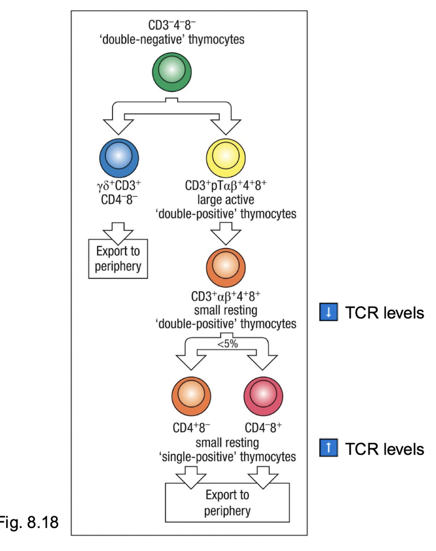 Double negative means no 4 and No 8 → then double positive with 4 and 8 → then selection makes single positive with either 4 or 8 and only single leaves the thymus