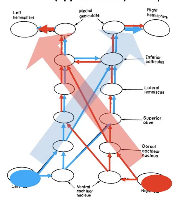 Each cerebral hemisphere receives input from each ear, but each ear projects more strongly to the opposite hemisphere.