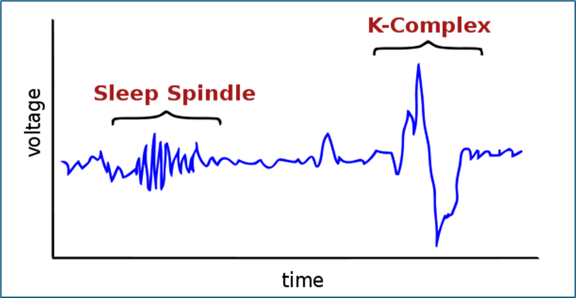 (NREM2). Here we see sleep spindles, which are bursts of high-frequency waves, and K complexes, which are singular high-amplitude waves