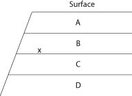 The following question refer to the figure below, which shows an outcrop of sedimentary rock whose strata are labeled A-D.