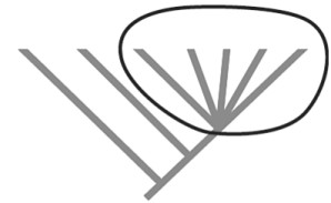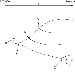 The horizontal axis of the cladogram depicted below is a timeline that extends from 100,000 years ago to the present; the vertical axis represents nothing in particular. The labeled branch points on the tree (V-Z) represent various common ancestors. Let's say that only since 50,000 years ago has there been enough variation between the lineages depicted here to separate them into distinct species, and only the tips of the lineages on this tree represent distinct species.