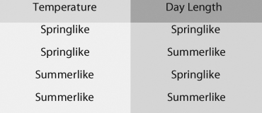How does the same population of moths produce such different-looking caterpillars on the same trees? To answer this question, the biologist caught many female moths from the same population and collected their eggs. He put at least one egg from each female into eight identical cups. The eggs hatched, and at least two larvae from each female were maintained in one of the four temperature and light conditions listed below.
