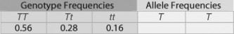Researchers studying a small milkweed population note that some plants produce a toxin and other plants do not. They identify the gene responsible for toxin production. The dominant allele (T) codes for an enzyme that makes the toxin, and the recessive allele (t) codes for a nonfunctional enzyme that cannot produce the toxin. Heterozygotes produce an intermediate amount of toxin. The genotypes of all individuals in the population are determined (see chart) and used to determine the actual allele frequencies in the population.