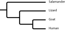 Salamanders are a sister group to the group containing lizards, goats, and humans.
