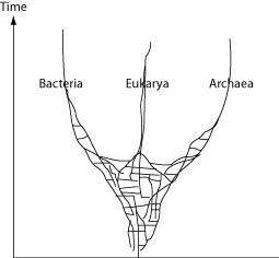 The following question refer to this phylogenetic tree, depicting the origins of life and of the three domains. Horizontal lines indicate instances of gene or genome transfer.