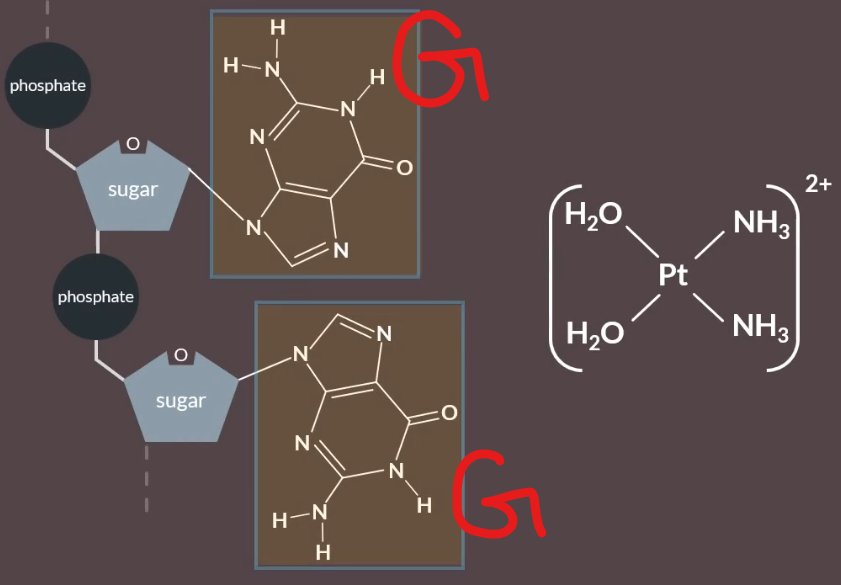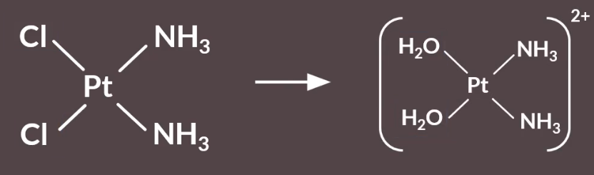 When Cisplatin first enters the cell, the chloride ligands are replaced by water ligands, via a ligand substitution reaction.