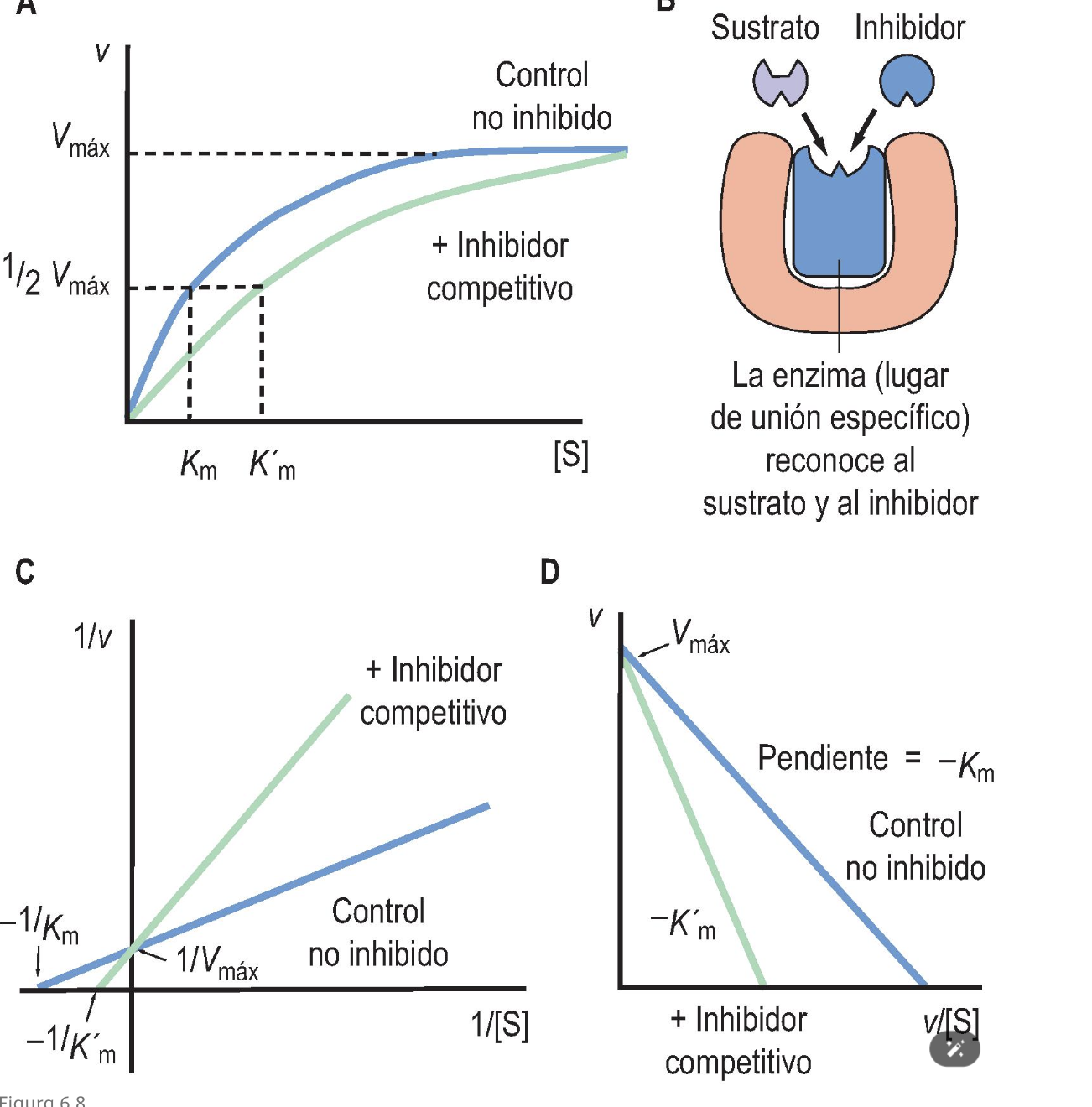 V o F: Los inhibidores competitivos provocan un aumento aparente de la K m sin modificar la V máx