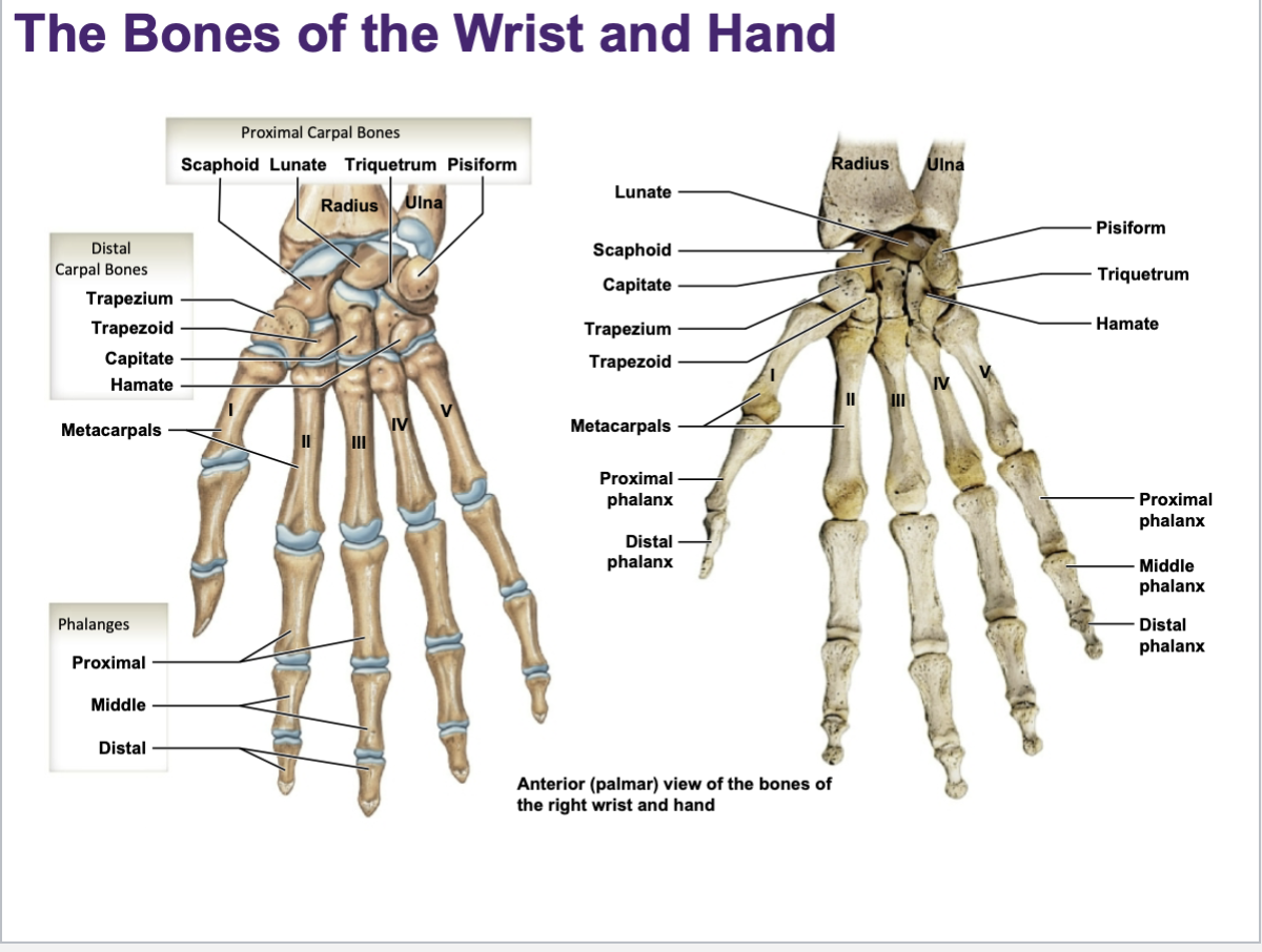 There are ___ phalanges in each hand (labeled as proximal, middle, and distal)