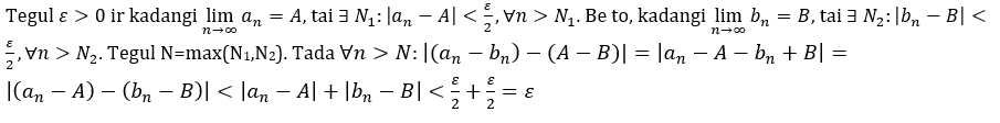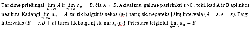 Tegul lim(n → ∞) an=A ir ε >0. ∃ atviras intervalas (A- ε, A+ ε), kuriam priklauso visi sekos an nariai nuo tam tikro N, jau n>Nε. Tik a1,...,anε narių nepriklauso šiam intervalui. Taigi, tik baigtinės narių sk. nepriklauso intervalui. Vadinasi galima išrinkti didžiausią ir mažiausią iš jų.