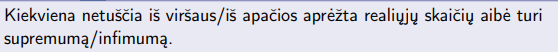 Skaičiu˛ M vadinsime aibės E supremumu, jei ∀x ∈ E teisinga x ≤ M arba ∀ϵ > 0, ∃x* ∈ E : M − ϵ < x* ≤ M.