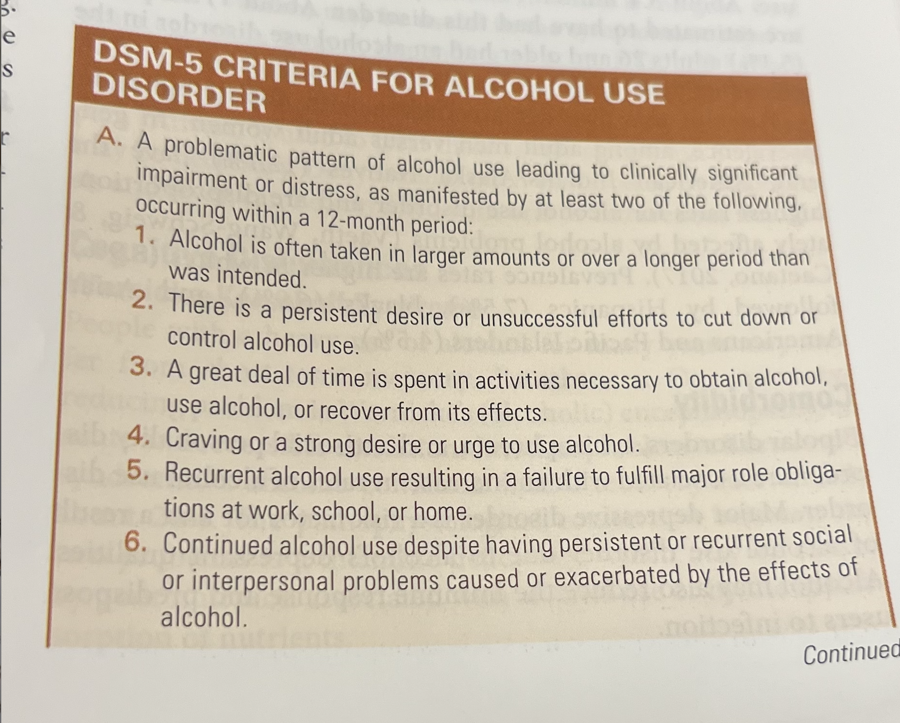 . Differentiate between various substance abuse disorders (e.g., alcohol, stimulants, sedatives, hallucinogens). Based on clinical manifestations, diagnostic criteria, and potential complications.