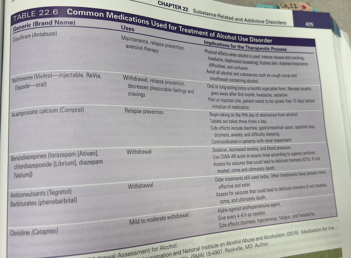 uDisulfiram- antebuse, tachycradia, sweating, blurry vision, resp distress, teach not to drink alchohol, contraindicated in pregnancy. Inform the patient that ingesting alcohol while taking this medication produces a toxic reaction that causes intense nausea and vomiting, headache, sweating, flushed skin, respiratory difficulties, and confusion. Avoid all alcohol and substances like cough syrup and mouthwash that contain alcohol.