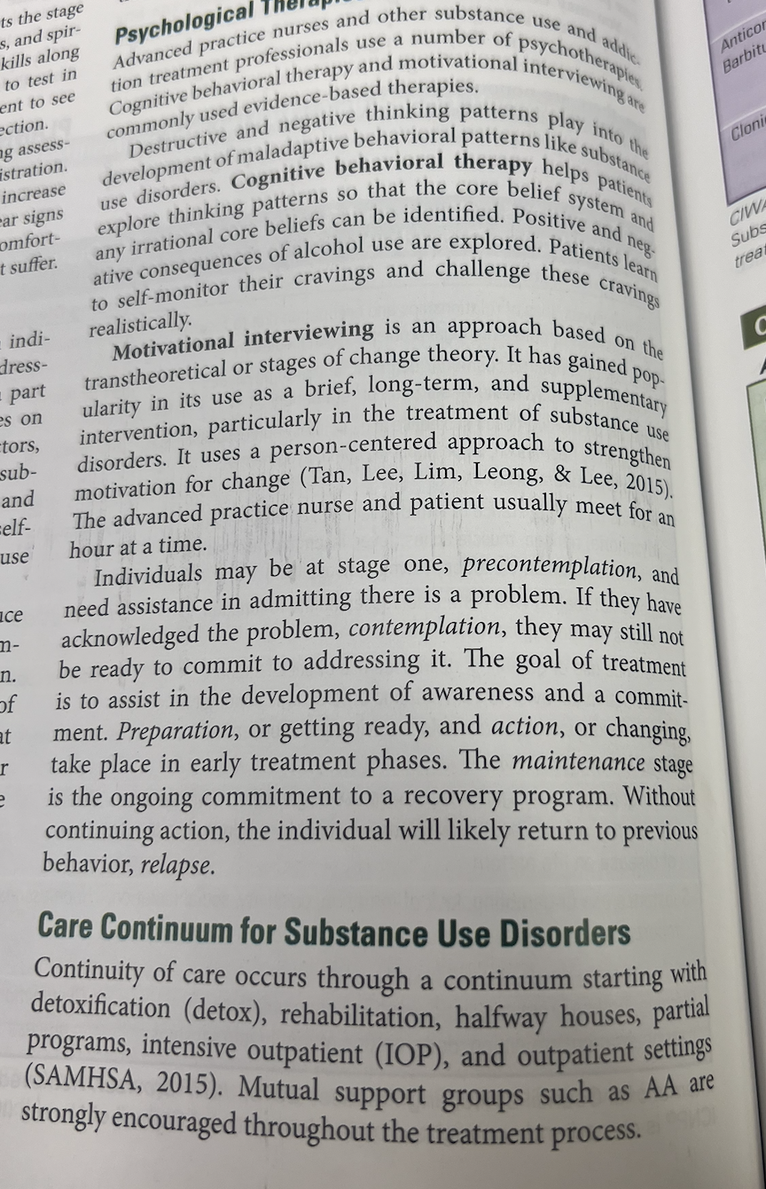4. Describe therapeutic interventions for patients with substance abuse disorders.